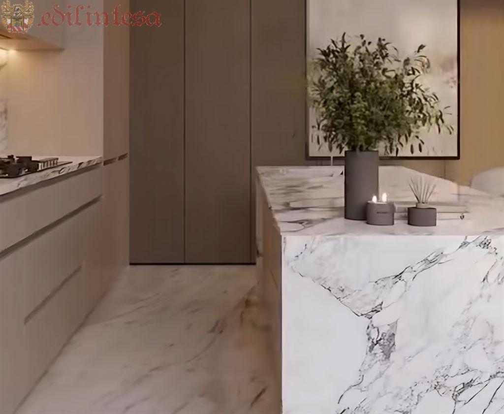 La zona giorno e´ luminosa ed ampia con area cooking con isola in open sull´elegante salotto capace di un grande divano angolare e chaise-longue.