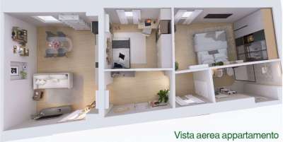 luminoso soggiorno, cucina a vista, camera matrimoniale, cameretta, bagno con doccia finestrato.