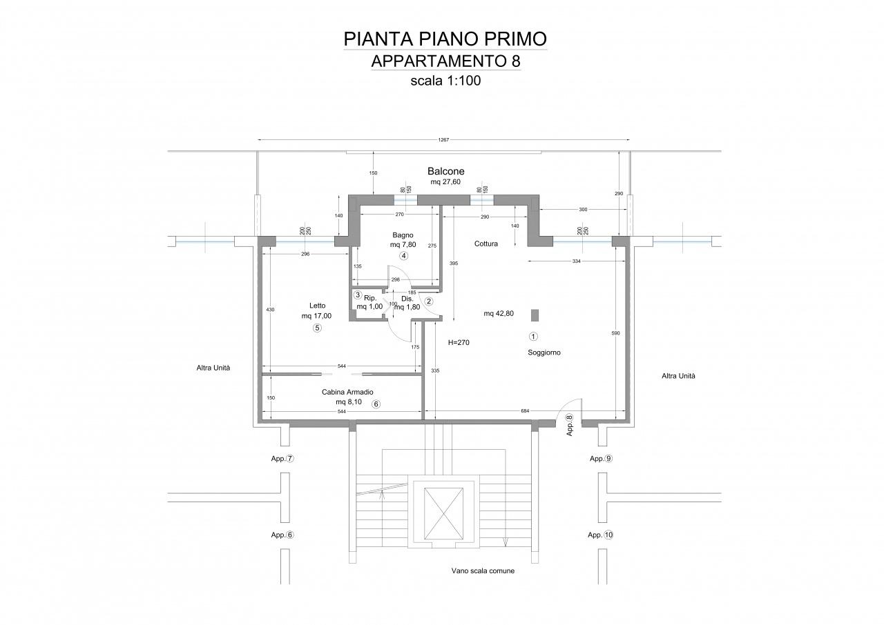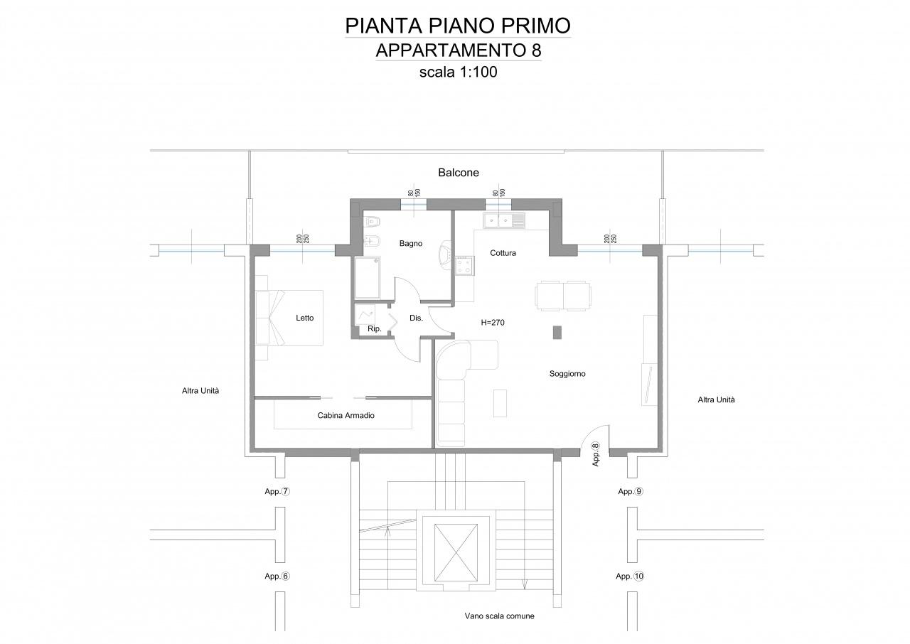 L´appartamento in oggetto sarà composto da ampio soggiorno e cucina di circa 42 mq, bagno padronale , disimpegno con attacchi lavatrice e asciugatrice, camera matrimoniale dotata di una incantevole cabina armadio e un comodo terrazzo.