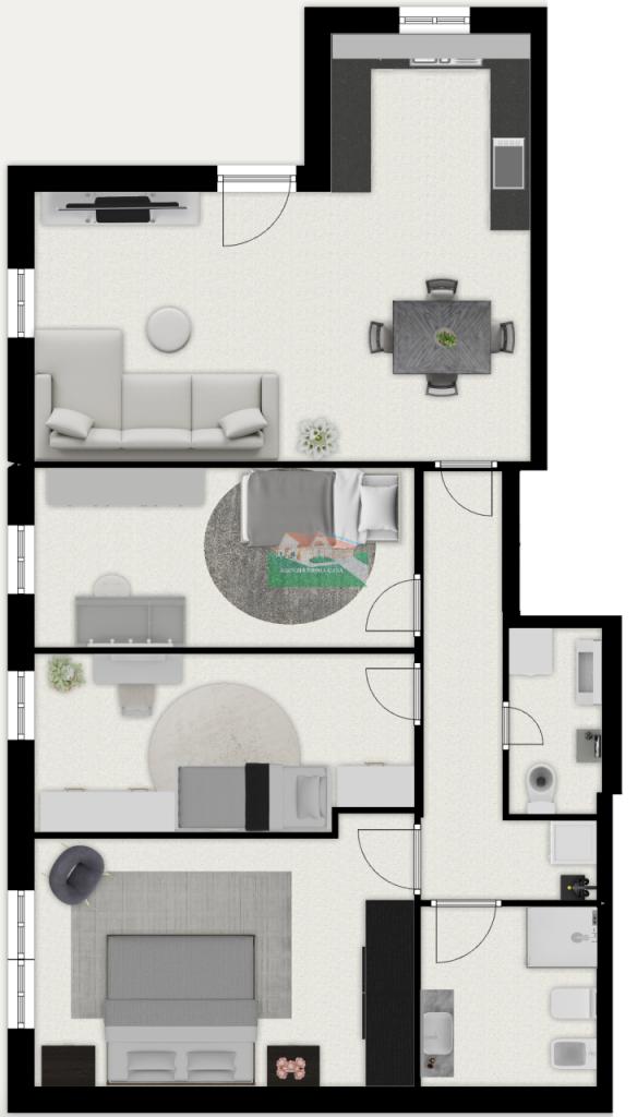 All´interno si compone da ampia sala con cucina, disimpegno, tre camere da letto (una matrimoniale e due singole) e due bagni.