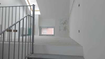 Questo spazioso monolocale di 70 mq è stato progettato per stupire: un unico ambiente che si eleva su due livelli, con pavimenti luminosi e lucernari che inondano di luce naturale il piano superiore.