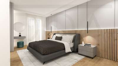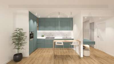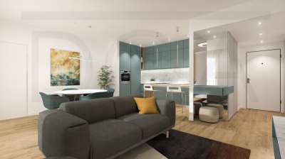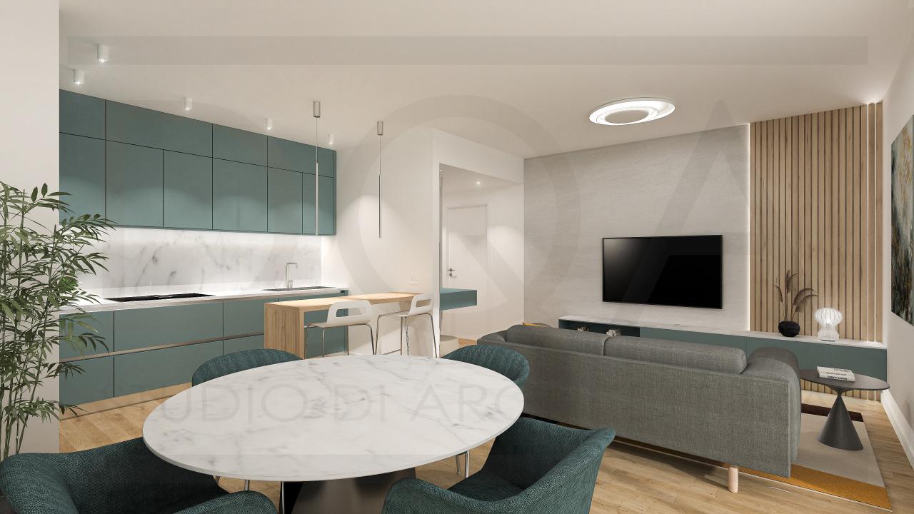 Composto da ingresso, soggiorno con cucina a vista e loggia di 15 mq, ripostiglio, 2 camere da letto e doppi servizi (uno interno alla camera matrimoniale).