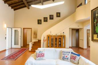 La proprietà si sviluppa principalmente al piano terra: ampio soggiorno con doppia altezza e camino, zona pranzo con vetrate affacciate sul porticato, cucina abitabile, due camere da letto ciascuna con bagno privato, oltre a studio/terza camera.