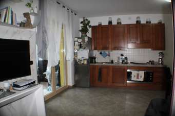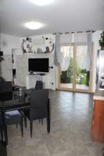 Ampio soggiorno con angolo cottura e accesso al giardino