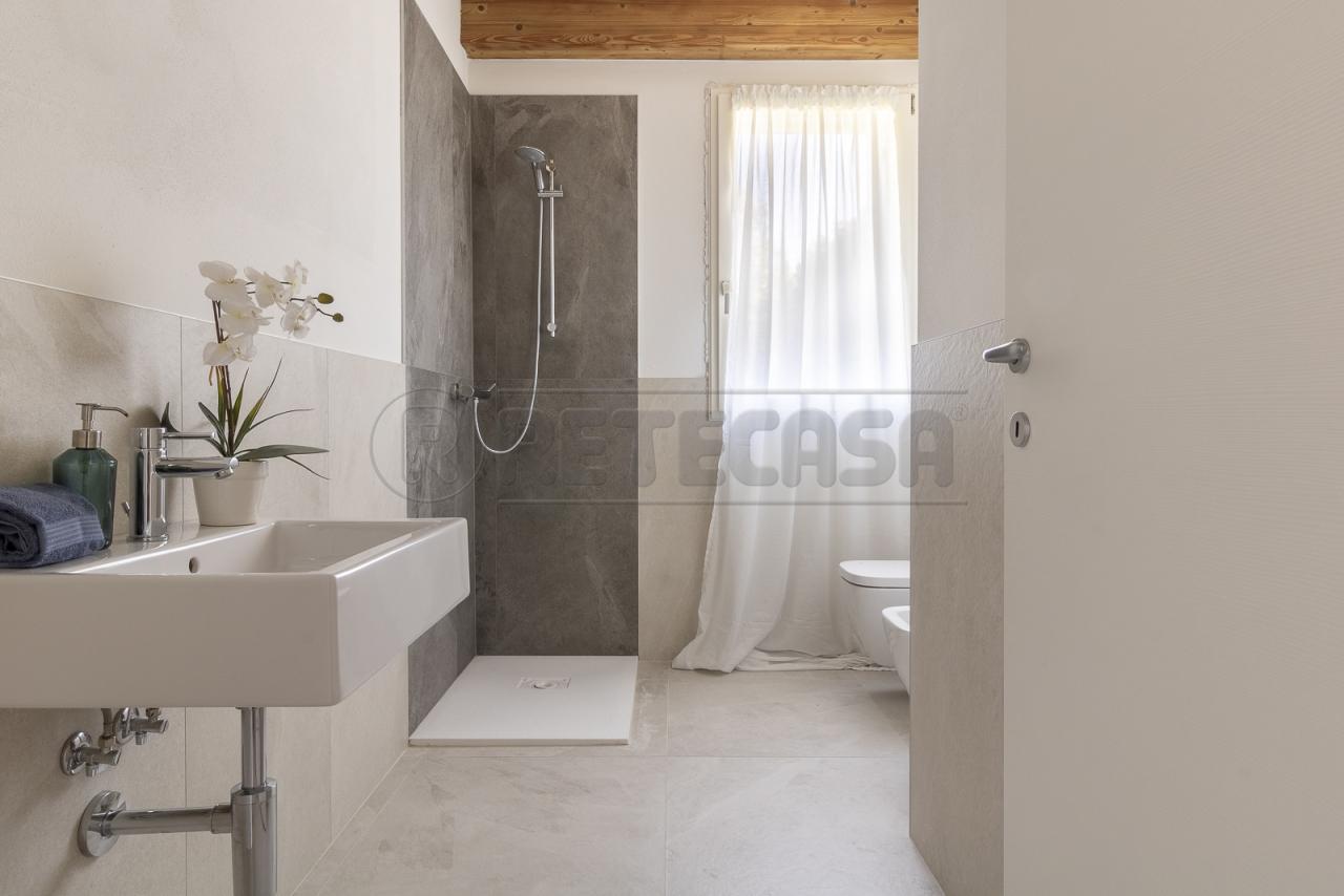 L’ingresso riservato attraverso il vano scale con ascensore, condiviso con sole altre 5 unità, conduce ad una luminosissimo soggiorno con sala da pranzo/cucina open space di complessivi ben 55 mq impreziosito dagli archi del portico e dalla caratteristica travatura a vista, il disimpegno ci conduce alla zona notte dove troviamo una camera matrimoniale, un bagno finestrato con doccia, una camera singola, la camera padronale con cabina armadio e bagno privato ed un comodissimo ripostiglio dove trova spazio la centrale termica e la lavanderia. Si completa di garage singolo al piano interrato, con possibilità di acquisto di un ulteriore box o posto auto scoperto.