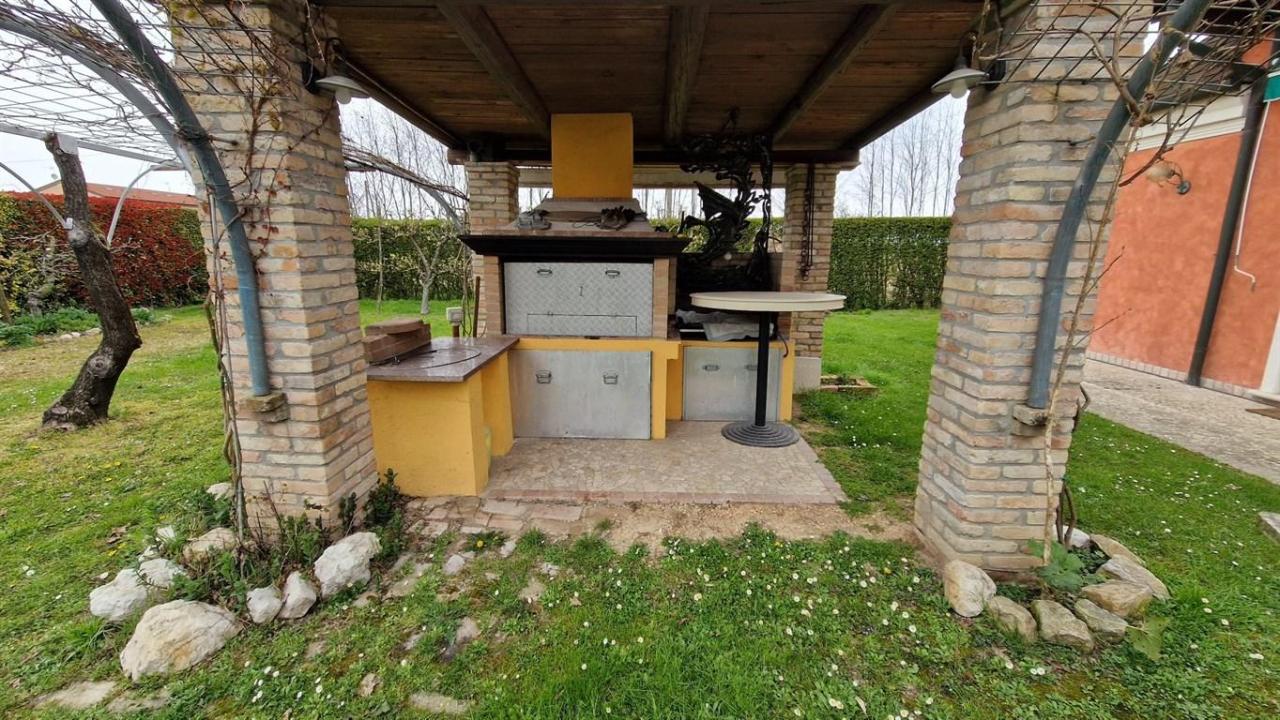 L’accesso avviene tramite un viale alberato che conduce alla rotonda di manovra e al doppio portico semicircolare. Il parco, completamente piantumato e perfettamente curato, ospita un’area barbecue attrezzata con camino, girarrosto e pergolato fisso, ideale per cene all’aperto.